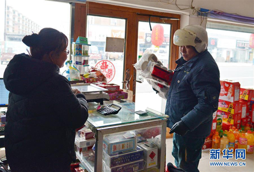 在琿春市春化鎮(zhèn),金仁哲(左)將代買的生活用品交到老人手中。