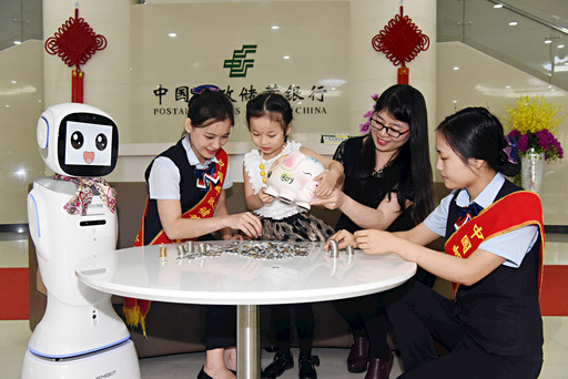 圖為帶著存錢罐的小姑娘在母親的陪同下到現(xiàn)金服務站兌換零散鈔?! 鹾D嫌浾?nbsp; 梁磊 攝影報道