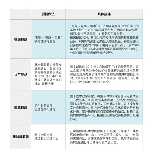 在國(guó)外,面對(duì)“數(shù)字化”帶來(lái)的沖擊,許多國(guó)家郵政企業(yè)選擇業(yè)務(wù)重組,以此來(lái)提高成本效率,部分郵政企業(yè)甚至剝離非核心業(yè)務(wù),以此釋放資金壓力,著眼未來(lái)投資(見(jiàn)圖表1)。
