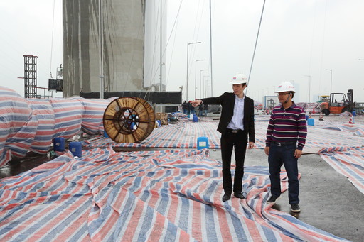 鄭硯平(左)于通車前夕再次來到南沙大橋施工現(xiàn)場做貸后檢查。張軼博 攝