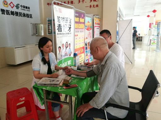 武漢市黃陂區(qū)雙鳳郵政營業(yè)所與口腔醫(yī)院開展異業(yè)合作。醫(yī)生在代發(fā)養(yǎng)老金的高峰期為客戶免費(fèi)測量血壓,并贈送客戶洗牙、拔牙優(yōu)惠券。左春卉 攝