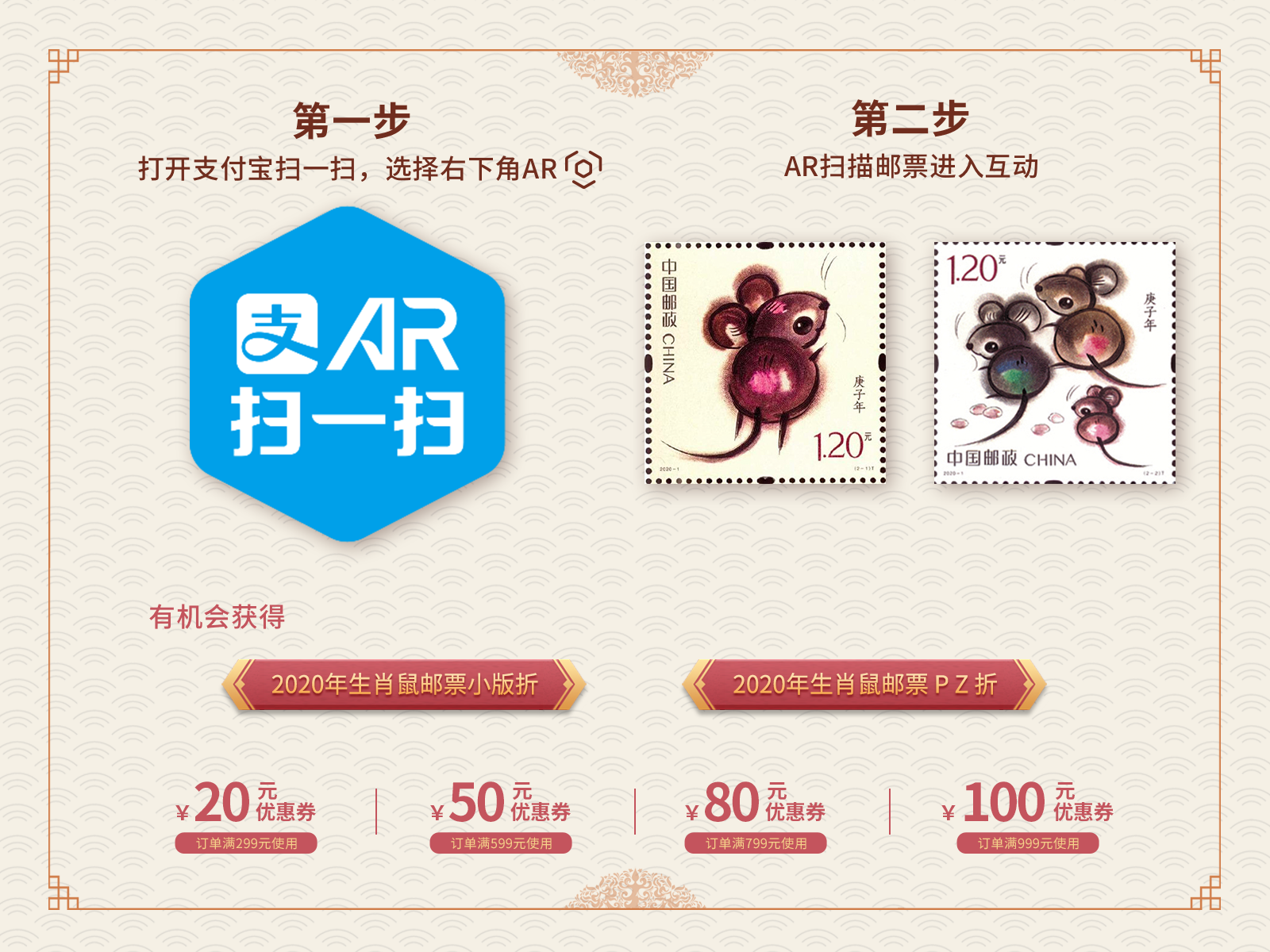 2020年是庚子年,也是我國(guó)生肖郵票發(fā)行40年。今年的《庚子年》鼠年生肖郵票,除了郵票本身,還帶來(lái)了非常多的趣味玩法,包括:看AR與生肖鼠互動(dòng)、DIY鼠年郵票送祝福、尋找奇妙博物館里的新年禮物、看直播抽大獎(jiǎng)。讓我們一一揭曉。