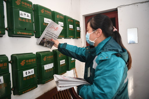 湖南省郵政分公司優(yōu)化網(wǎng)運作業(yè)組織和生產(chǎn)流程,縮短投遞內(nèi)部作業(yè)時限,讓投遞員提早出班,全力以赴做好黨報黨刊投遞工作,將黨中央關(guān)于疫情防控工作的最新指示精神及時、準確傳遞到千家萬戶。湖南省分公司為投遞網(wǎng)點配備了洗手液、消毒液、測溫儀,每隔兩小時對投遞作業(yè)現(xiàn)場進行消毒,出班前、歸班后對攬投車輛進行噴灑消毒;為投遞人員配備了醫(yī)用口罩,并在到崗和歸班時進行體溫檢測,體溫正常方可上崗。圖為2月11日,長沙市分公司車站路攬投員楊望歸在芙蓉區(qū)五里牌社區(qū)投遞當(dāng)日《人民日報》。 記者 劉園園 攝影報道