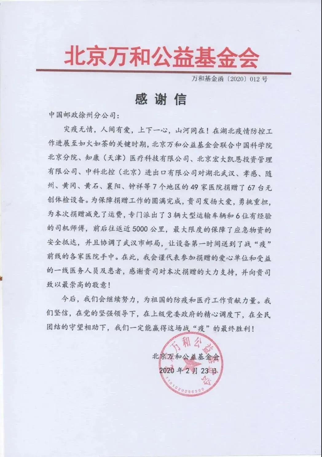 “國難當(dāng)前,只要這批物資能夠?qū)σ咔榉乐斡袔椭?,我們堅決不收費,大家齊心協(xié)力,確保第一時間送到位。”徐州市郵政分公司黨委書記、總經(jīng)理劉永紅跟捐贈企業(yè)溝通。