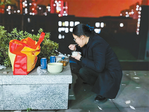 晚上9:00,學(xué)府第一小學(xué)封裝現(xiàn)場(chǎng),已經(jīng)是輾轉(zhuǎn)封裝的第4 所學(xué)校,沙坪壩曾家支局宋倩在封裝間隙將就吃點(diǎn)晚飯。向巍 攝