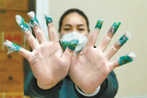 手被劃破,來不及找醫(yī)用膠布,萬州移民廣場(chǎng)郵政所負(fù)責(zé)人蒲春燕就用郵政膠帶包上手指接著打包。譚海霞 攝