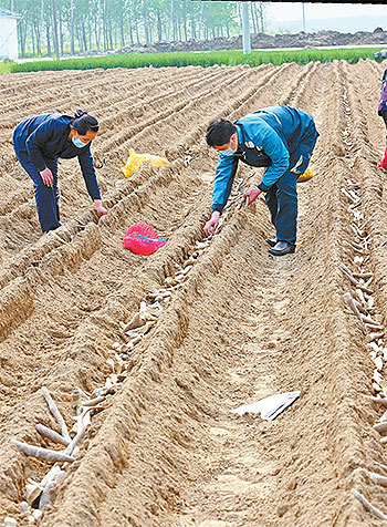 看到誰家忙不過來,趙本增只要有空就會(huì)主動(dòng)上前搭把手。圖為春耕時(shí)節(jié),趙本增與支局的幾位同事幫助村民王大柱種植山藥。