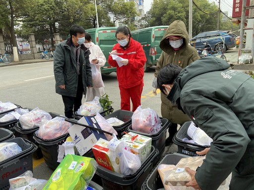 在湖北荊州,當(dāng)?shù)剜]政為小區(qū)居民配送生活物資。熊程程 攝