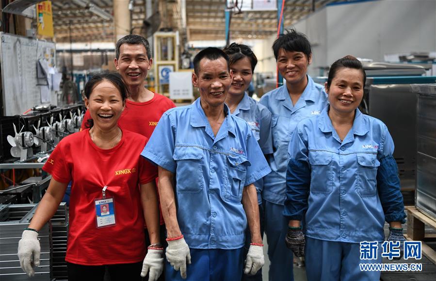 在佛山市三水區(qū)廣東星星制冷設(shè)備有限公司車(chē)間內(nèi),來(lái)自四川涼山彝族自治州鹽源縣的何公各(左二)和工友們合影(6月22日攝)。 新華社記者 鄧華 攝
