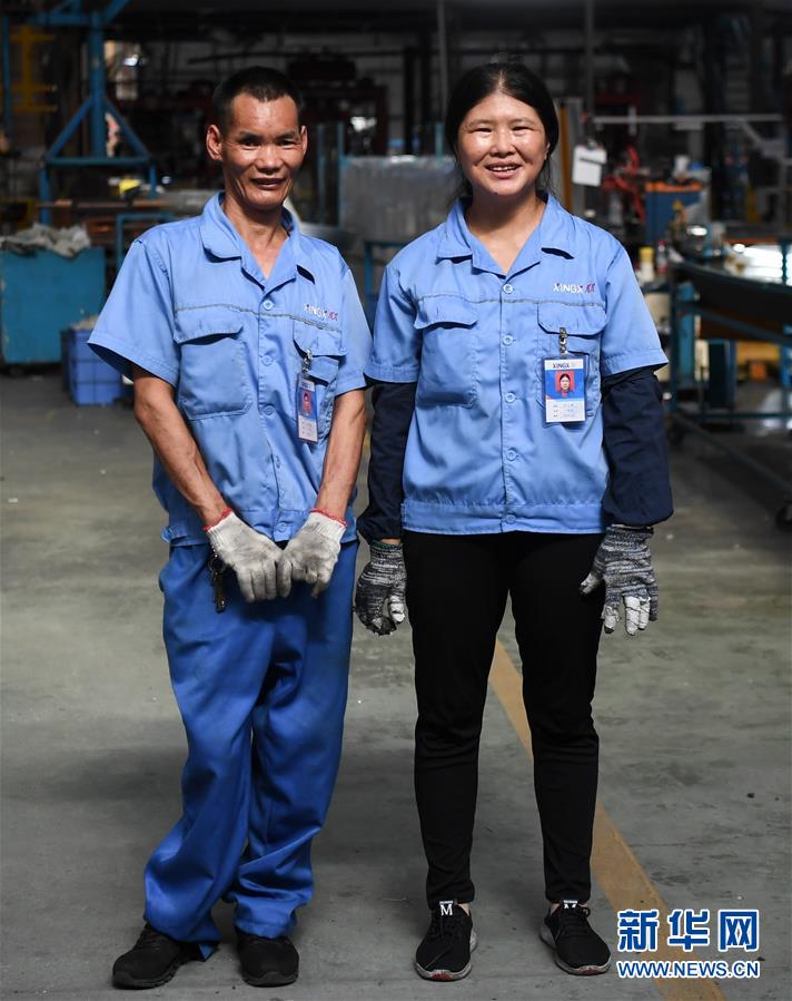 在佛山市三水區(qū)廣東星星制冷設(shè)備有限公司車(chē)間內(nèi),來(lái)自四川涼山彝族自治州鹽源縣的貧困務(wù)工人員李力挖(左)、何公各夫婦合影(6月22日攝)。 新華社記者 鄧華 攝