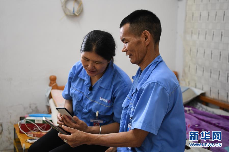 在佛山市三水區(qū)廣東星星制冷設(shè)備有限公司提供的夫妻宿舍里,李力挖(右)、何公各在休息時(shí)間玩手機(jī)(6月22日攝)。 新華社記者 鄧華 攝