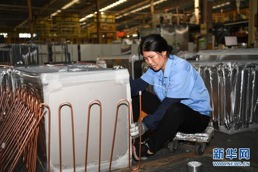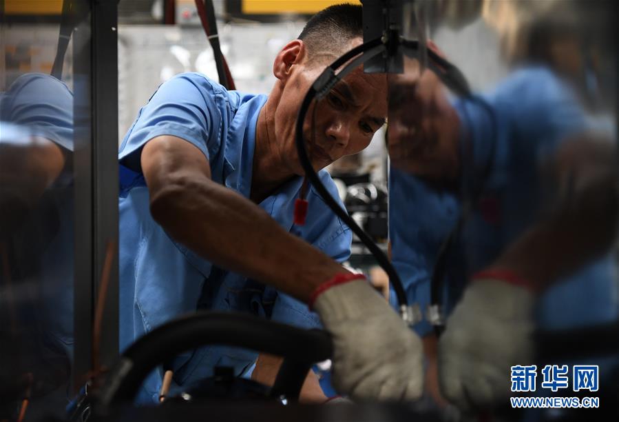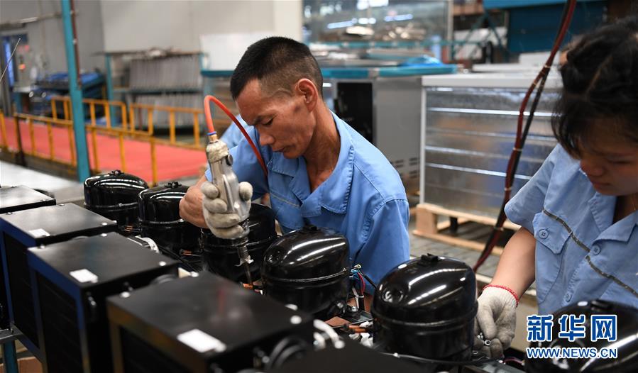 在佛山市三水區(qū)廣東星星制冷設(shè)備有限公司車(chē)間內(nèi),來(lái)自四川涼山彝族自治州鹽源縣的何公各在組裝設(shè)備(6月22日攝)。 新華社記者 鄧華 攝