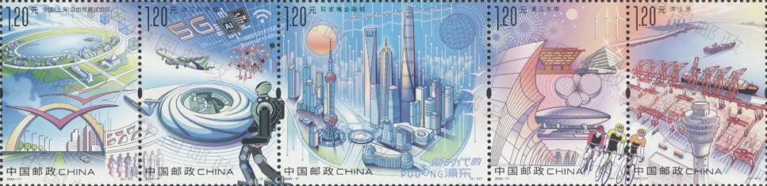 30年來,浦東在一片阡陌農(nóng)田上建成了一座功能集聚、要素齊全、設(shè)施先進(jìn)的現(xiàn)代化城市,成為我國改革開放的象征和上?,F(xiàn)代化建設(shè)的縮影。歷史是發(fā)展的見證,郵票是時(shí)代的剪影。此次發(fā)行的《新時(shí)代的浦東》特種郵票,鮮活呈現(xiàn)了浦東勇?lián)鷩覒?zhàn)略、奮進(jìn)新時(shí)代的生動(dòng)實(shí)踐,有力彰顯了中國特色社會(huì)主義的強(qiáng)大生命力。郵票一套5枚,選取上海自貿(mào)試驗(yàn)區(qū)、張江科學(xué)城、陸家嘴金融城、浦江東岸、洋山港等作為表現(xiàn)主題,將浦東日新月異的變化濃縮于方寸之間。