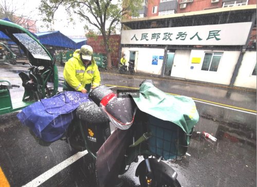 朝陽區(qū)今天早上就發(fā)布了道路結(jié)冰黃色預(yù)警,提醒市民外出一定要注意安全。這樣的天氣,一方面要注意交通安全,另一方面更要保護包裹和報刊不被雨淋雪濕。為此,北京郵政朝陽區(qū)分公司各個單位加強了安防措施,通過班前會提醒、重點人提示、檢查車輛安全、加發(fā)防雨用具等措施,以確保郵路安全暢通。一大早,甜水園營業(yè)部就在大院內(nèi)支起了帳篷,要求大家在帳篷內(nèi)分揀郵件,帳篷里放不下了,大家就搶著郵件一路小跑往室內(nèi)運送,為的是不讓包裹淋濕。