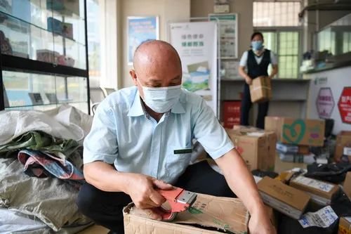 謝堅(jiān)在廣東珠海市外伶仃島郵政所給破損郵件包裝箱粘上膠帶(4月21日攝)。