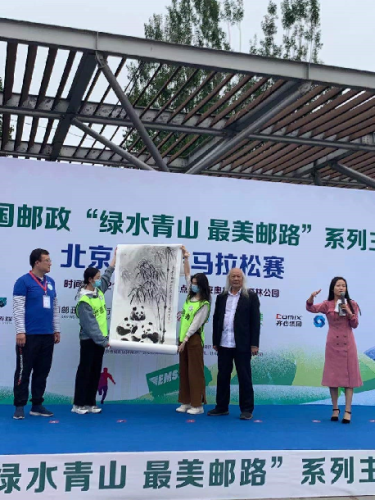 16日,2021年中國(guó)郵政“綠水青山最美郵路”系列主題賽北京站——“逐夢(mèng)冬奧 相約北京”半程馬拉松賽,暨“祝福冬奧”明信片首發(fā)式在北京奧林匹克森林公園舉辦?;顒?dòng)現(xiàn)場(chǎng),“祝福冬奧”明信片原畫(huà)作者楊竹向體育郵局捐贈(zèng)畫(huà)作。