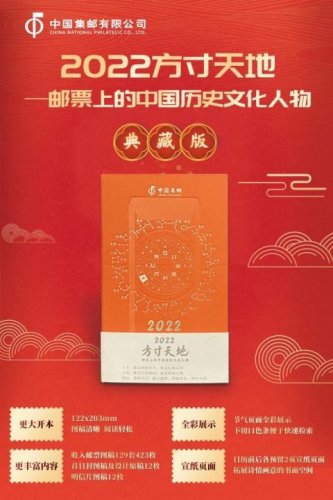 中國(guó)集郵有限公司同時(shí)推出2022集郵日歷典藏版《方寸天地——郵票上的中國(guó)歷史文化人物》,以時(shí)間為經(jīng)、以史事為緯、以郵票為媒,將已發(fā)行郵票上的138位中國(guó)歷史文化人物及相關(guān)的故事、作品按照歷史脈絡(luò)呈現(xiàn),收入中國(guó)歷史文化人物、節(jié)日、節(jié)氣、生肖相關(guān)郵票圖稿129套423枚、首日封圖稿及設(shè)計(jì)原稿12枚、明信片圖稿12枚。