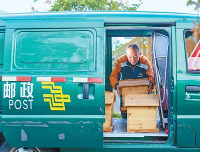 在浙江省湖州市長(zhǎng)興縣,林城鎮(zhèn)郵政所蜂產(chǎn)業(yè)專(zhuān)職投遞員王國(guó)慶把要寄遞的蜂箱搬上快遞車(chē)。 許斌華攝(影像中國(guó))