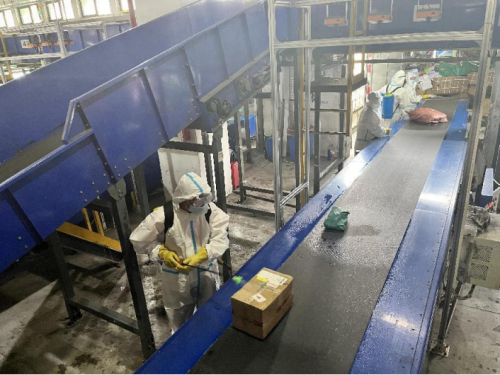 郵件到達(dá)營投部后,郵政人員對車輛和郵件還要進(jìn)行全面消殺?!肮ぷ魅藛T上崗前發(fā)送健康碼和行程碼,到崗后第一件事先測量體溫做好登記,佩戴手套、口罩等,然后對車輛全部消殺一遍,對郵件外包裝至少每2小時進(jìn)行一次消殺……”中國郵政集團(tuán)有限公司南京市鼓樓區(qū)寄遞事業(yè)部副總經(jīng)理馬曉東說道,營投部每日進(jìn)行多頻次消殺和通風(fēng),從操作間地面、快遞傳送帶到每一個快遞包裹,都會噴灑消毒,確保全覆蓋、無死角,保證生產(chǎn)生活環(huán)境清潔安全。