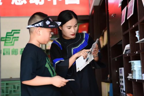 60平方米的主題郵局,擺放著各類主題郵品,游客的增多,讓負(fù)責(zé)人麻秀珍有點(diǎn)忙不過來了?!艾F(xiàn)在是暑期,很多學(xué)生和小朋友都會來這里參觀游玩,我會主動給他們介紹明信片和郵品上關(guān)于十八洞村的故事,很多人都對這些感興趣,會買一份紀(jì)念郵品帶回去給自己的同學(xué)、朋友,很有紀(jì)念意義?!彼f。一位小朋友站在柜臺前對比了幾款明信片后,選擇了一套《苗鄉(xiāng)十八洞》的明信片,還讓麻秀珍給他的每一張明信片都蓋上郵戳。