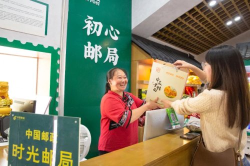 石柱縣分公司文化傳媒中心負(fù)責(zé)人向志華介紹,初心郵局在布置方面融入了黨建、石柱、本土文化、農(nóng)特產(chǎn)品等眾多元素,兩層樓構(gòu)造,一層展示當(dāng)?shù)氐霓r(nóng)特產(chǎn)品,比如中益土蜂蜜、鹽竹筍、紅辣椒等;二層通過紀(jì)念郵票區(qū)、家書初心區(qū)、文創(chuàng)產(chǎn)品區(qū),提供特色郵政服務(wù)?!爸黝}郵局取名初心郵局,一方面是契合當(dāng)?shù)爻跣男≡?、初心廣場的主題,另一方面也是展示‘人民郵政為人民’的初心。”