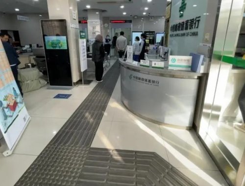 除了手語服務(wù),初次踏入香山支行的客戶或許還會(huì)發(fā)現(xiàn),行內(nèi)有一條灰色的盲道,從柜臺(tái)服務(wù)窗口延伸,直達(dá)主要街道。