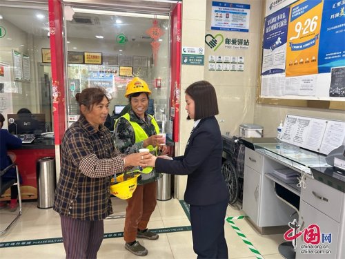 郵儲(chǔ)銀行工作人員為建筑工人送上熱水
