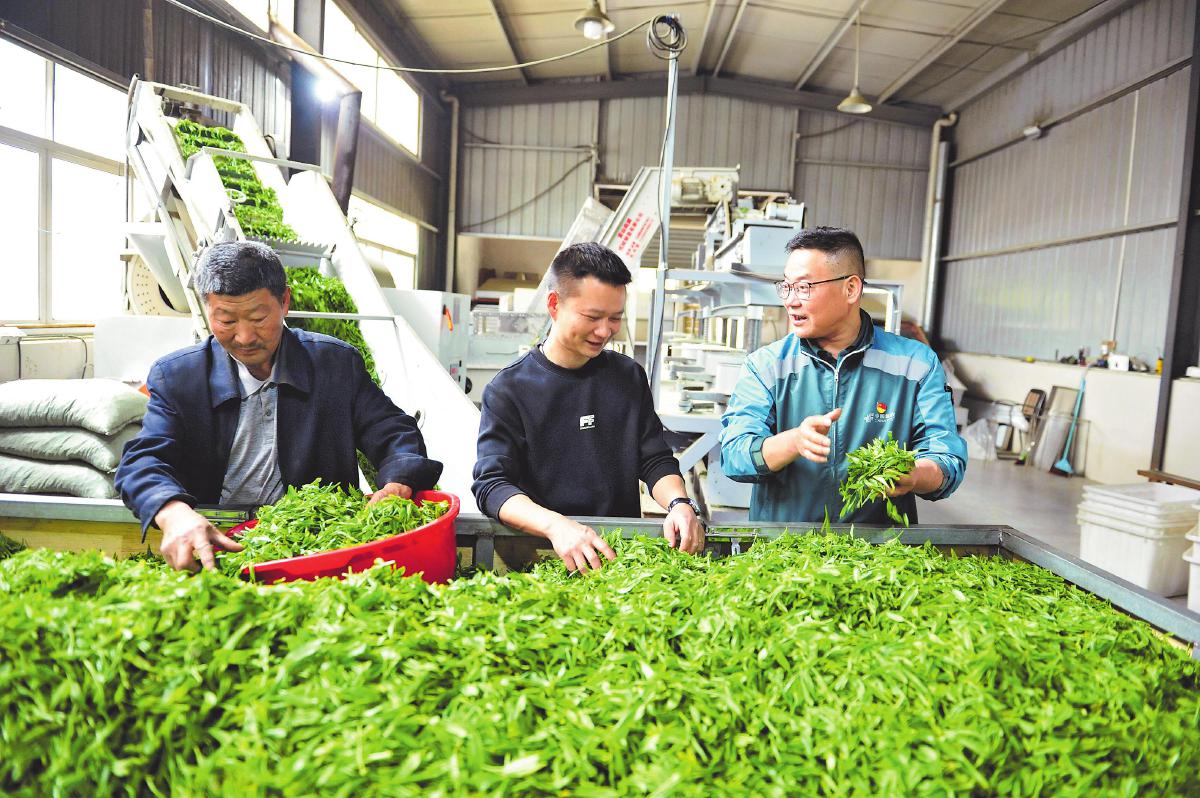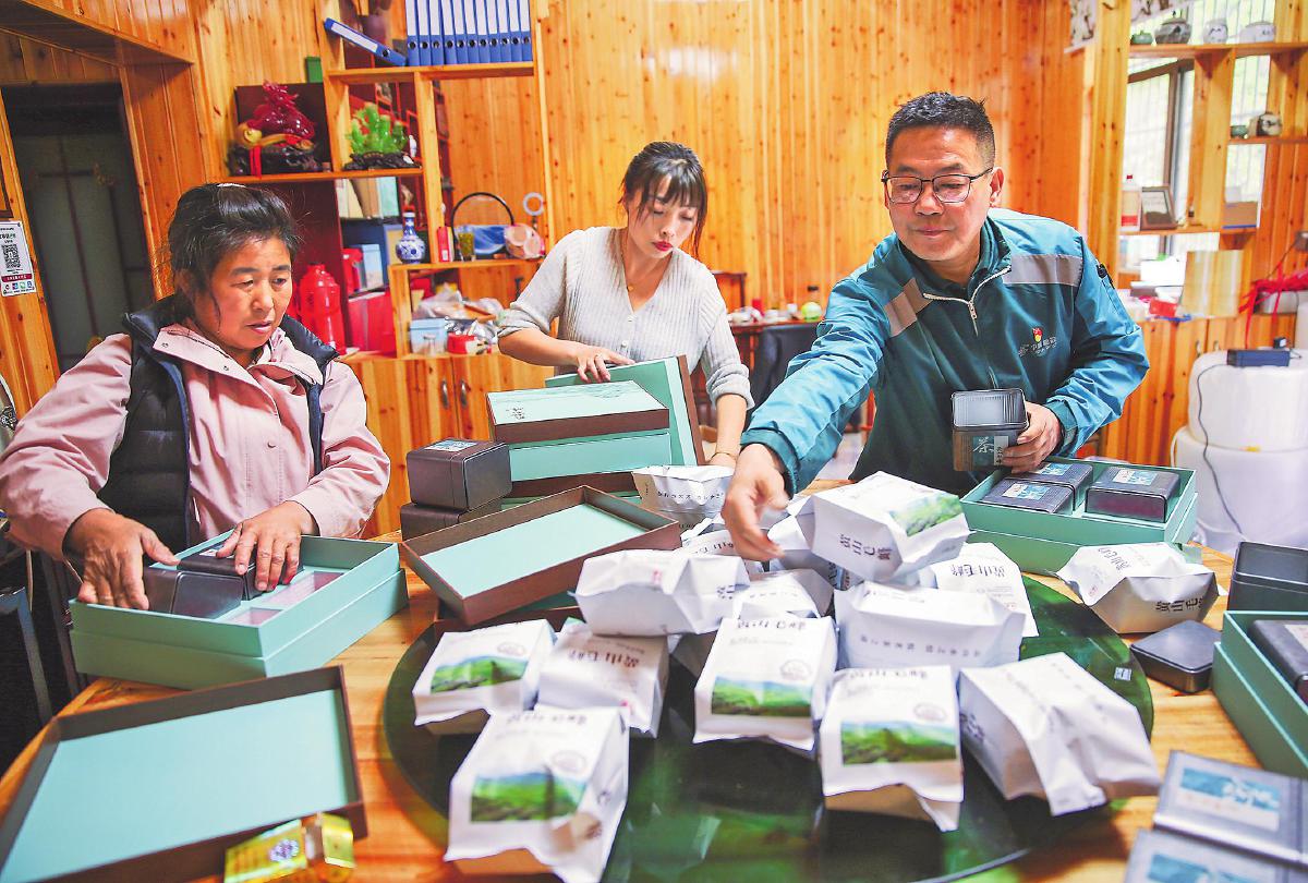 郵政攬投員與茶廠(chǎng)員工一起分裝茶葉?!跣炖住z