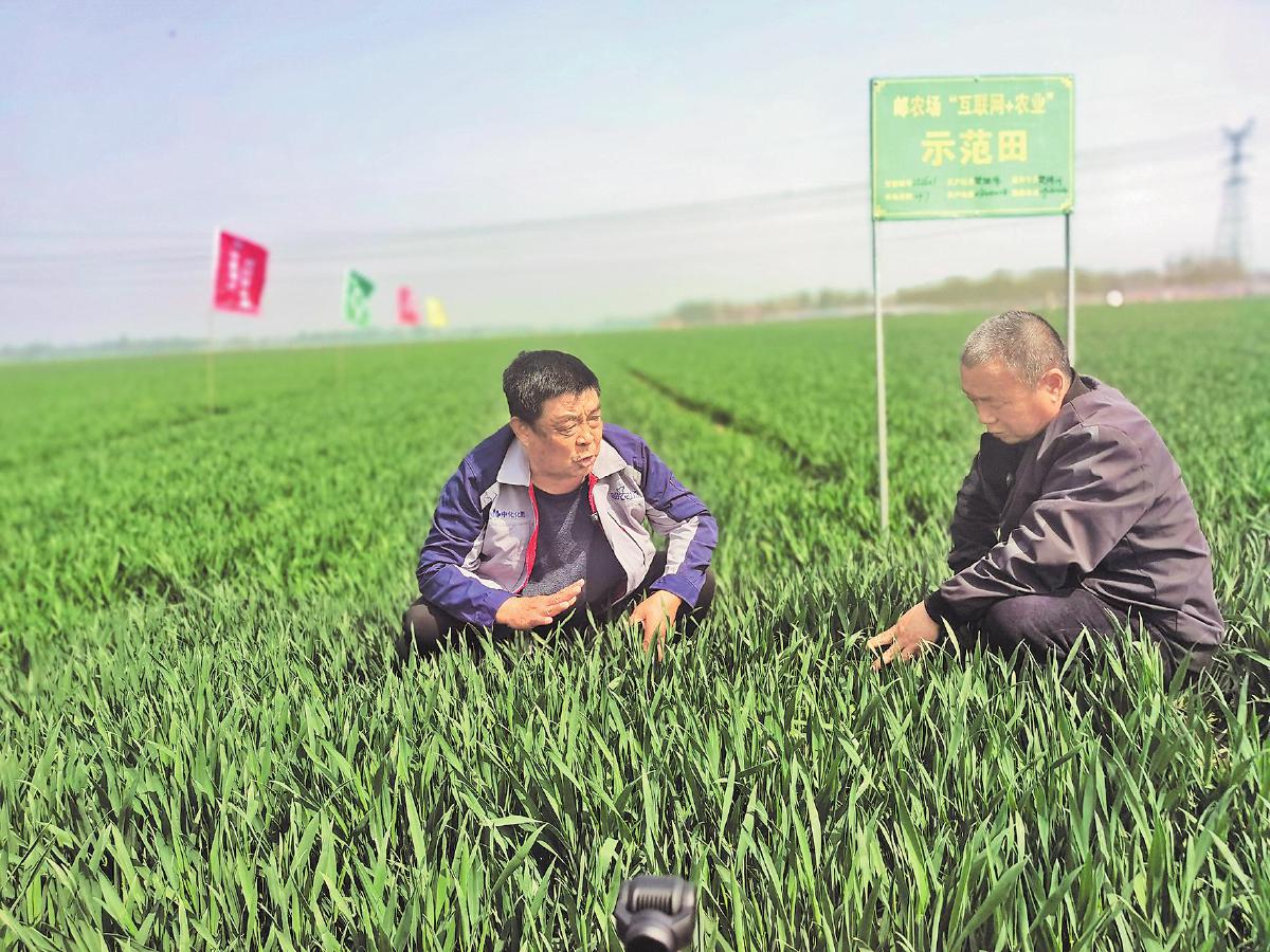 “郵農(nóng)場”服務專員樊瑞河(左)在田間巡查,指導村民做好春小麥的管理。