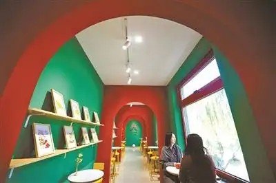 轉(zhuǎn)入二樓,郵政綠與宮門紅相結(jié)合,鮮明的色彩古老又熱烈,加上橙色的高腳椅、白色的小圓桌,光是色彩就足以拿捏住青年人易雀躍的心。點(diǎn)一杯咖啡,再來(lái)份精致的西點(diǎn),坐在窗前,然后就被窗外的景致鎖住心神:萬(wàn)寧橋的碧波垂柳、火德真君廟的飛閣重檐、什剎海畔的游人如織……