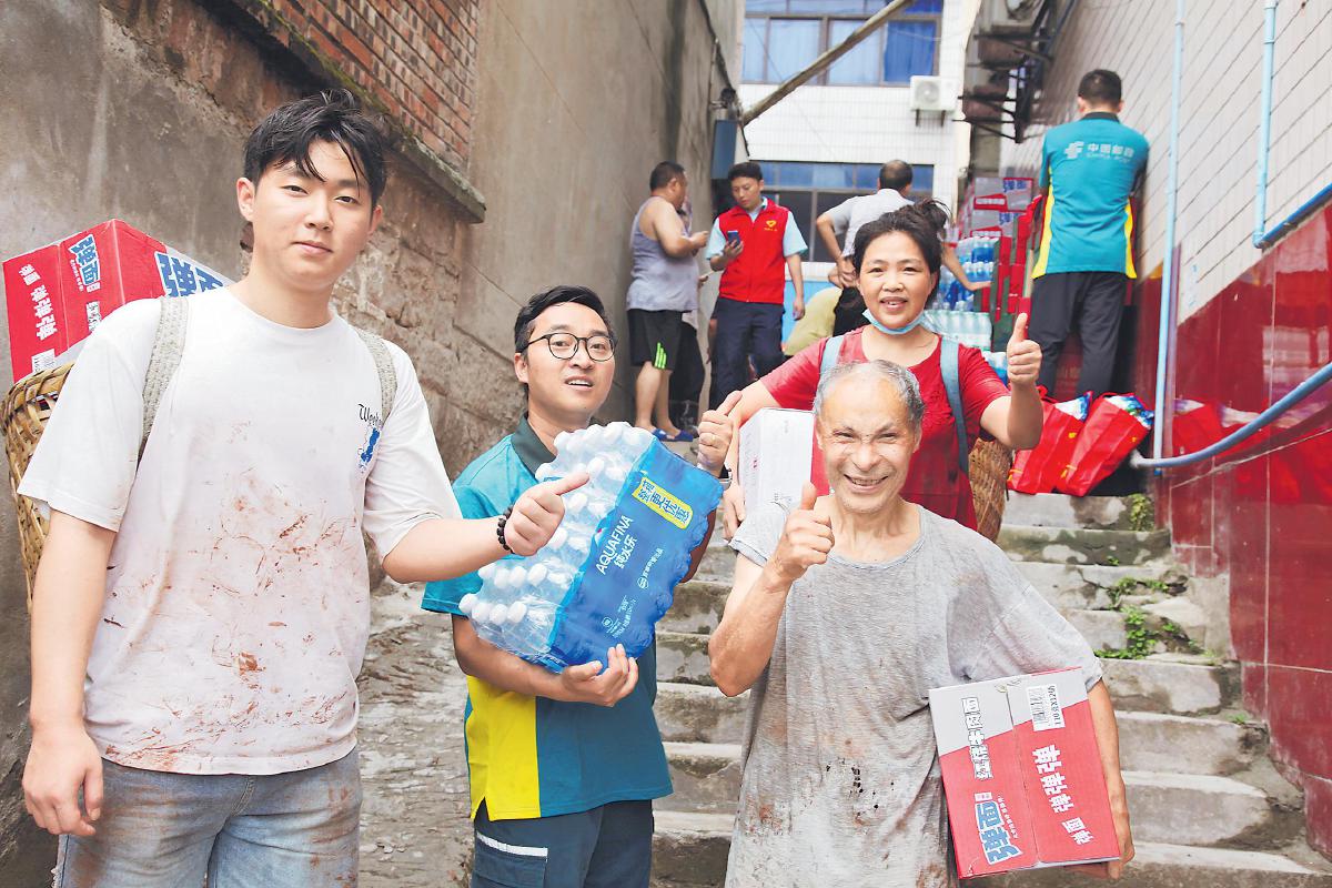 沒(méi)過(guò)多久,受災(zāi)居民陸續(xù)趕來(lái)。他們有的背著背簍,有的赤著腳,褲腳上沾滿了泥土,衣衫被汗水濕透。餐飲店經(jīng)營(yíng)者丁平拿到物資后,連連道謝:“太感謝你們了,這些物資真是解了我的燃眉之急!”