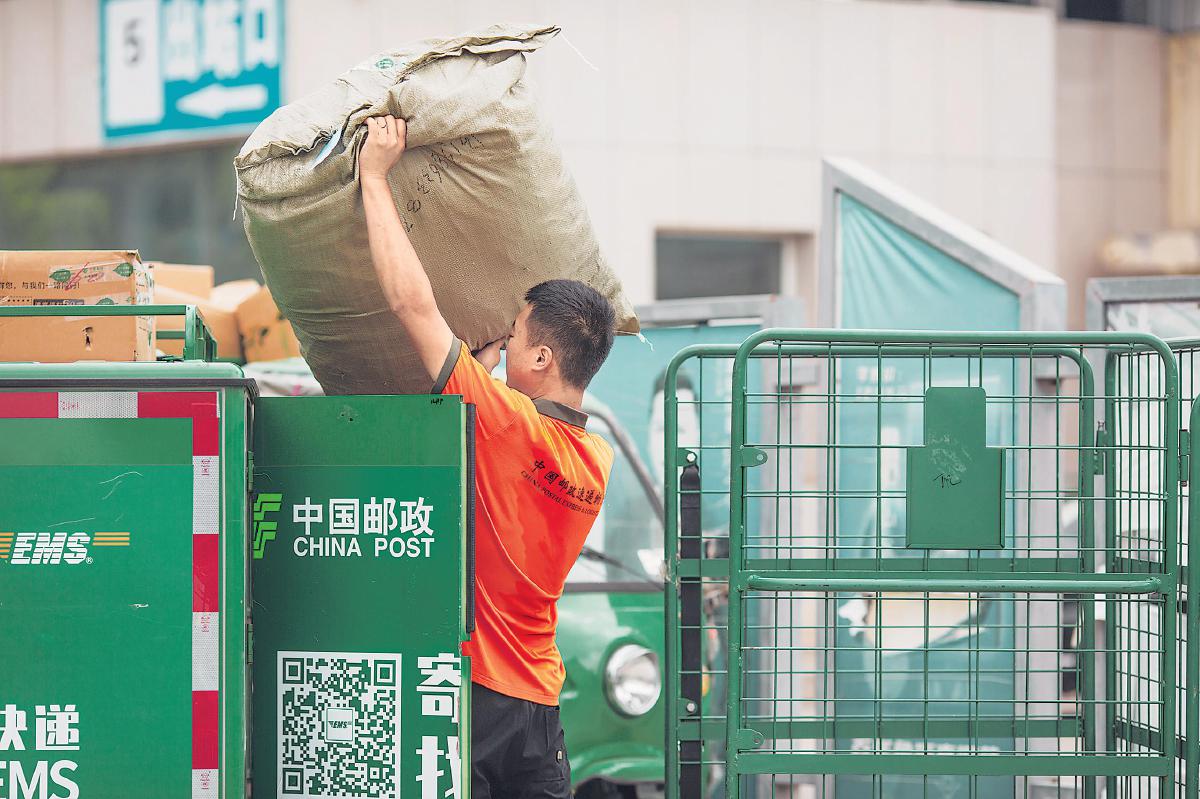 山東省沂源縣郵政分公司投遞員在裝運(yùn)郵件。