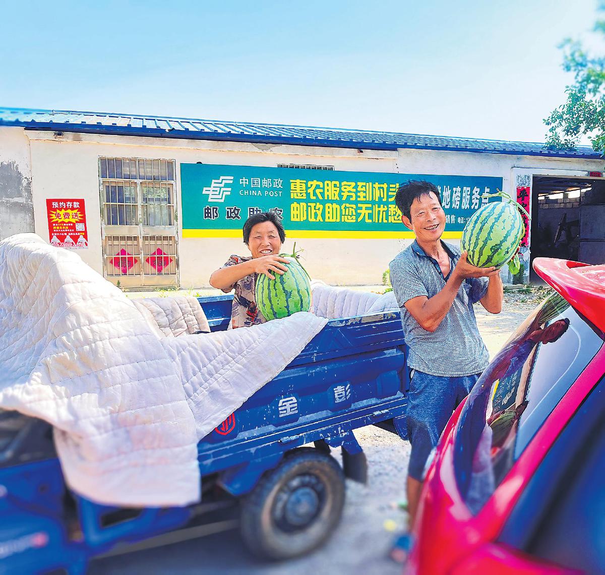 在濟(jì)寧市泗水縣郵政分公司設(shè)立的服務(wù)點(diǎn),西瓜種植戶準(zhǔn)備過(guò)磅裝車(chē)?!鯇O慧芹 攝