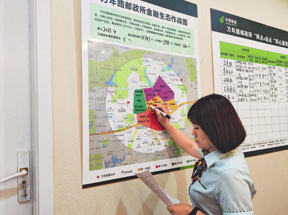 渝北區(qū)萬年路郵政所負(fù)責(zé)人在“同心圓”管理看板上更新業(yè)績。