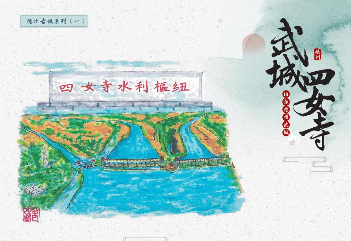 此次首發(fā)的文創(chuàng)產(chǎn)品涵蓋郵資封、明信片、郵資機(jī)宣傳戳及主題宣傳戳四大類,每一件都浸潤著四女寺的文化基因。其中,“四女”郵資封(右上圖)以工筆重彩呈現(xiàn)經(jīng)典場景:畫面中四位女子于槐樹下漫步,旁側(cè)牌坊古樸,飛鳥點(diǎn)綴天際,還原“四女侍親,栽槐立誓”的民間傳說,四女常伴樹側(cè),行孝事、話桑麻,樹與人相襯成景,演繹著傳統(tǒng)孝道的溫度,讓古老美德在時光里熠熠生輝,供后人感懷、傳揚(yáng);而“四女寺水利樞紐”明信片(右下圖)則通過航拍視角與細(xì)節(jié)特寫的結(jié)合,展現(xiàn)這座黃河下游重要水利工程的宏偉氣勢——堤壩蜿蜒如巨龍伏波,閘門啟閉間盡顯古人治水的智慧結(jié)晶,讓現(xiàn)代觀者得以觸摸歷史的溫度。