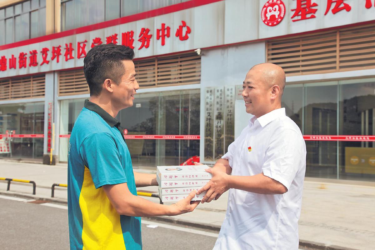 江蘇各地郵政充分發(fā)揮勞模先進(jìn)引領(lǐng)作用,持續(xù)拓展《習(xí)近平談治國(guó)理政》第五卷發(fā)行的深度和廣度。徐州市郵政分公司在各網(wǎng)點(diǎn)積極營(yíng)造圖書(shū)發(fā)行宣傳的濃厚氛圍,同時(shí)開(kāi)展“勞模領(lǐng)學(xué)”活動(dòng)。江蘇省勞模、豐縣郵政分公司王溝支局投遞員趙本增帶領(lǐng)“勞模創(chuàng)新工作室”的黨員共同學(xué)理論、悟原理。他還來(lái)到王溝鎮(zhèn)程集村村委會(huì),開(kāi)展政務(wù)圖書(shū)發(fā)行宣講活動(dòng)。蘇州市郵政分公司組建重大主題圖書(shū)發(fā)行專班,覆蓋征訂、供貨、配送等全流程,嚴(yán)控“安全、及時(shí)、準(zhǔn)確”三大標(biāo)準(zhǔn);優(yōu)化干支線運(yùn)輸銜接,確保圖書(shū)第一時(shí)間送達(dá);在線下網(wǎng)點(diǎn)、黨建陣地,發(fā)揮勞模代表和先進(jìn)典型的帶動(dòng)作用,營(yíng)造濃厚的學(xué)習(xí)、宣傳氛圍?;窗彩泻闈蓞^(qū)郵政分公司邀請(qǐng)全國(guó)勞模、退休員工唐真亞深入基層單位開(kāi)展圖書(shū)征訂宣傳。在老子山鎮(zhèn)政務(wù)服務(wù)中心的宣講會(huì)上,唐真亞結(jié)合自身25年“水上郵路”的服務(wù)經(jīng)歷,以樸實(shí)生動(dòng)的語(yǔ)言分享了《習(xí)近平談治國(guó)理政》第五卷學(xué)習(xí)感悟,引發(fā)大家的共鳴。宿遷市勞模、宿遷市城區(qū)郵政分公司來(lái)龍支局負(fù)責(zé)人王永震走進(jìn)宿豫區(qū)來(lái)龍鎮(zhèn)光明社區(qū),和社區(qū)黨員一起學(xué)習(xí)《習(xí)近平談治國(guó)理政》第五卷。他結(jié)合書(shū)中“扎實(shí)推進(jìn)共同富?!钡膬?nèi)容,分享了宿遷郵政助力鄉(xiāng)村振興的實(shí)踐案例,得到大家的認(rèn)同。