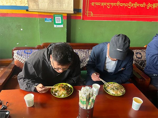 午飯時間,鄉(xiāng)政府旁的索多藏餐館里擠滿了來用餐的人。有觀光的游客,有像我們一樣到這里工作的外鄉(xiāng)人,還有本地的老百姓。記者和曲巴一起回憶起10年前在普瑪江塘只能吃面包、泡面的采訪經(jīng)歷。曲巴說:“現(xiàn)在鄉(xiāng)上開了3家餐館,大家也能吃上熱乎乎的飯菜了?!庇浾唿c了一份青椒肉絲蓋飯,曲巴要了一份小白菜蓋飯。我們吃得一干二凈!