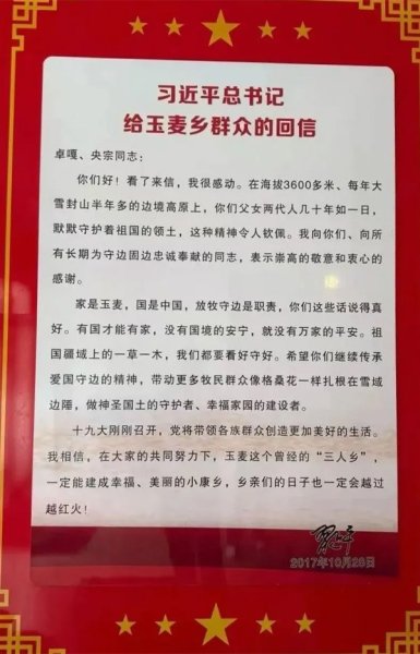 跟隨卓嘎的腳步,采訪組走進(jìn)玉麥鄉(xiāng)政府,在左邊墻上的大幅展框里,是習(xí)近平總書記給玉麥鄉(xiāng)群眾的回信,“祖國疆域上的一草一木,我們都要看好守好。希望你們繼續(xù)傳承愛國守邊的精神,帶動(dòng)更多牧民群眾像格?;ㄒ粯釉谘┯蜻呞?,做神圣國土的守護(hù)者、幸福家園的建設(shè)者”。