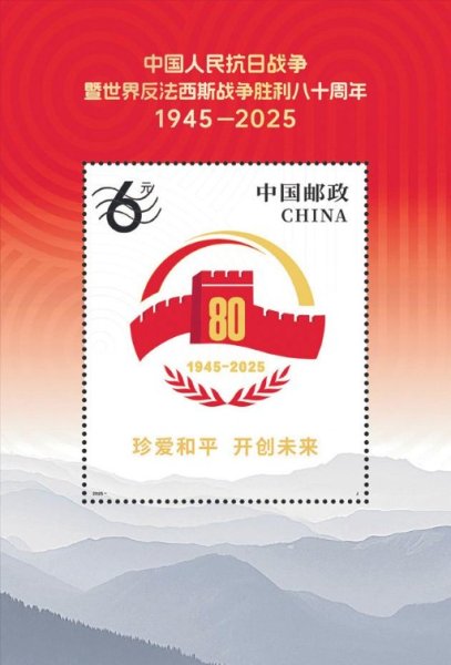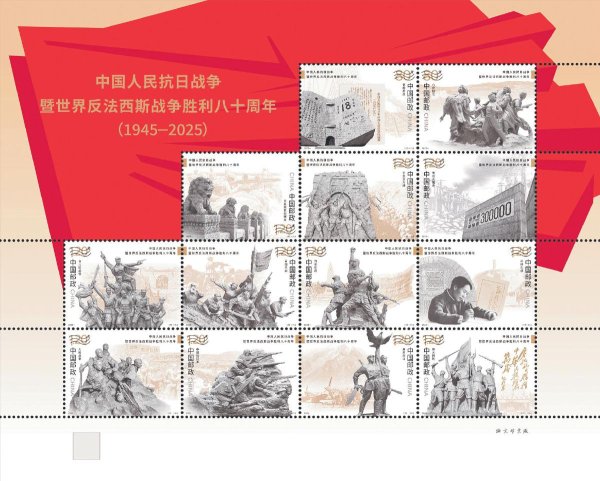 根據(jù)黨中央有關(guān)中國人民抗日戰(zhàn)爭(zhēng)暨世界反法西斯戰(zhàn)爭(zhēng)勝利80周年紀(jì)念活動(dòng)安排,中國郵政于9月3日發(fā)行《中國人民抗日戰(zhàn)爭(zhēng)暨世界反法西斯戰(zhàn)爭(zhēng)勝利八十周年》紀(jì)念郵票1套13枚、小型張1枚,全套面值為20.8元。