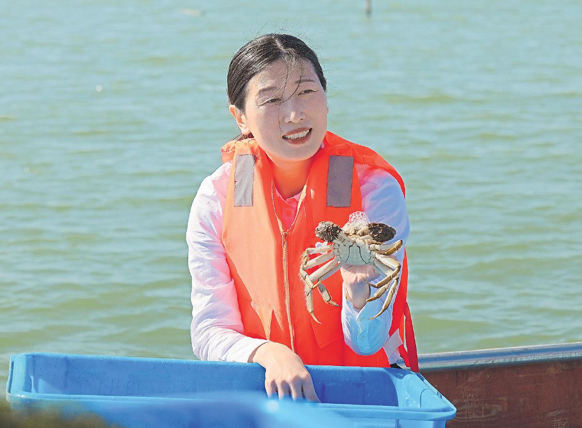 蔣雪萍在現(xiàn)場(chǎng)直播推介大閘蟹。