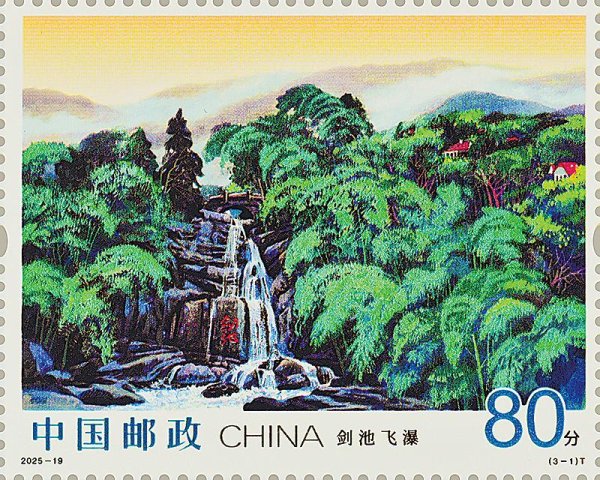第一枚“劍池飛瀑”(見圖),敘述了莫干山的古老傳說。郵票畫面聚焦劍池瀑布自蒼崖飛瀉而下的剎那,與周邊環(huán)繞的茂林翠柏、蒼巖石壁共同講述干將、莫邪鑄劍的傳奇故事。第二枚“群墅點翠”,呈現(xiàn)了莫干山的建筑風貌。此枚郵票將掩映在翠竹間眾多風格各異的別墅盡收眼底,別墅群落依山就勢,錯落層疊,紅瓦青磚與修竹勁松相映成趣。第三枚“旭光云?!?,描繪了莫干山的日出景象。該枚郵票定格了莫干山旭日東升的壯麗景象,旭光臺作為莫干山觀賞日出的絕佳觀景臺,將天地交輝的盛景盡收眼底。
