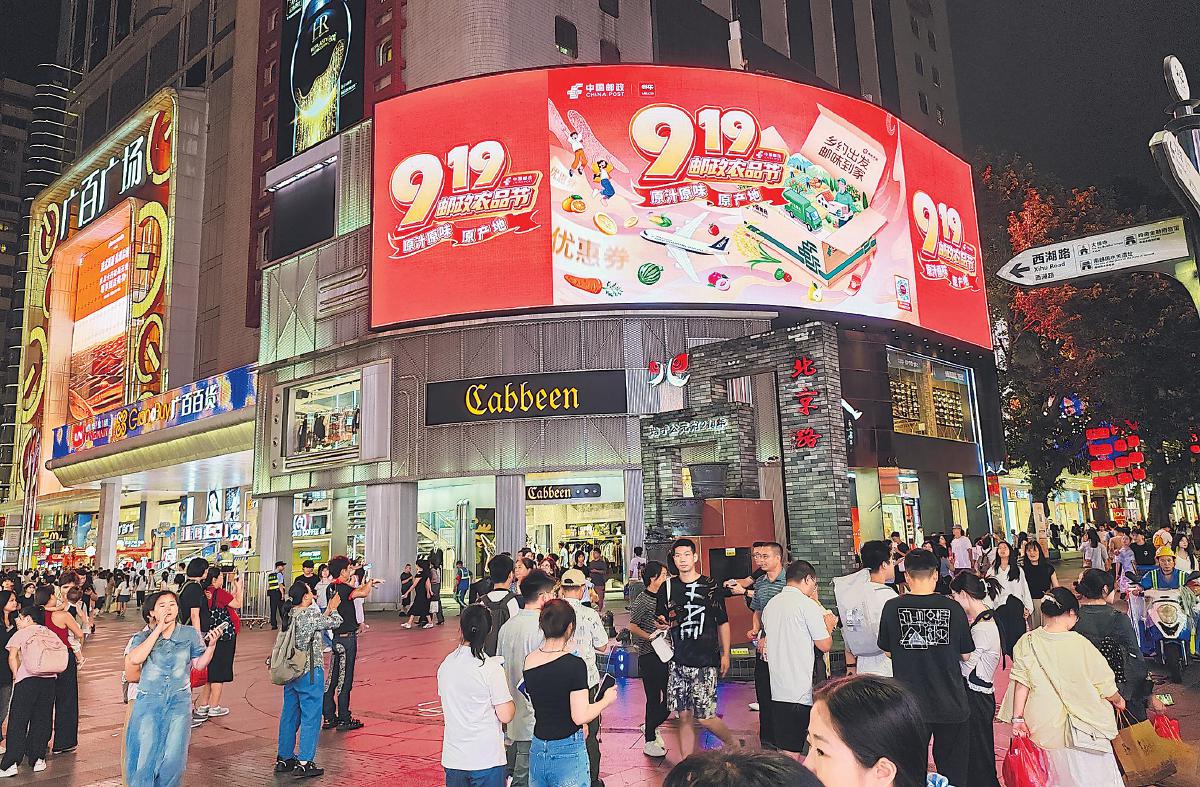9月23日,2025年“中國農(nóng)民豐收節(jié)”拉開帷幕。當(dāng)天,“919”郵政農(nóng)品節(jié)宣傳大屏在北京、廣州、深圳、武漢、長沙、南昌、哈爾濱多地繁華街區(qū)亮相,以都市核心商圈的流量勢能,提升郵政農(nóng)品節(jié)的品牌知名度與行業(yè)影響力。圖為在廣州市北京路,“919”宣傳大屏閃亮奪目。