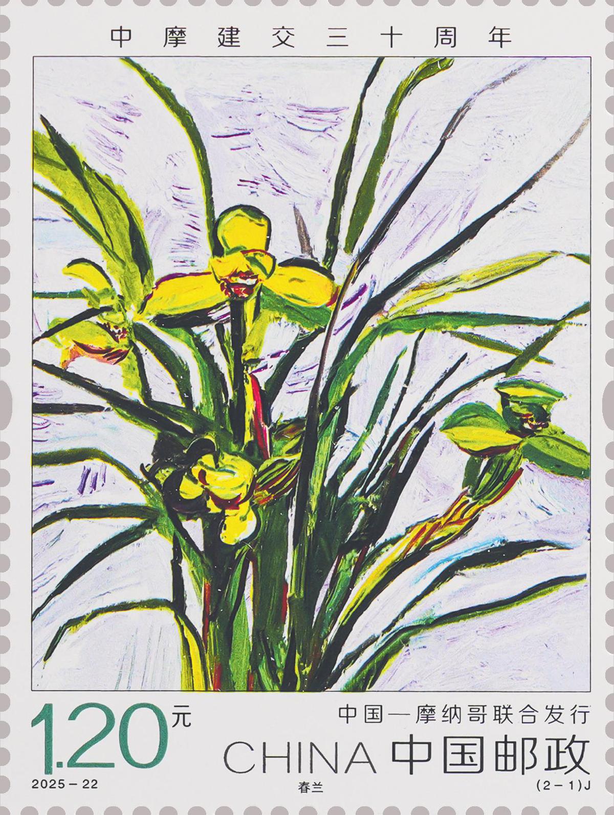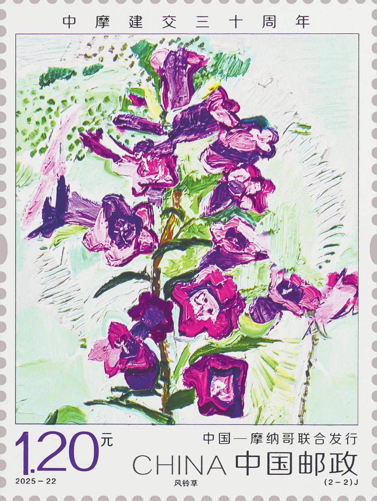 本套郵票分別選用具有兩國民族特色和深厚文化內(nèi)涵的花卉,中國選用栽培歷史悠久的春蘭,摩納哥選用美麗靈動(dòng)的風(fēng)鈴草,兩種花卉彰顯出生態(tài)文明的內(nèi)在價(jià)值與精神追求。郵票圖案采用油畫表現(xiàn)方式,設(shè)計(jì)師通過大膽的構(gòu)圖、恣意的筆觸、靈活的色彩搭配,對(duì)具體的物象進(jìn)行抽象提煉,從而營造出一種生動(dòng)而富有生命力的畫面效果。兩枚郵票承載著“友誼長存”的深層寓意,希望中摩關(guān)系不斷取得新進(jìn)展,更好造福兩國人民。