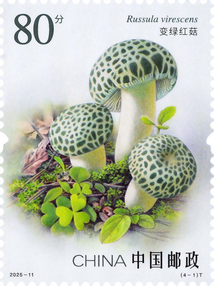第一枚“變綠紅菇”,俗稱(chēng)“青頭菌”,隸屬紅菇科。菌蓋較硬,呈青綠色,表面有青褐色的鱗片。其分布廣泛,鮮美的口感深受人們喜愛(ài)。郵票設(shè)計(jì)突出其青翠欲滴的色澤,并融入森林生態(tài)背景,使整體形象兼具自然野趣與美學(xué)韻味。