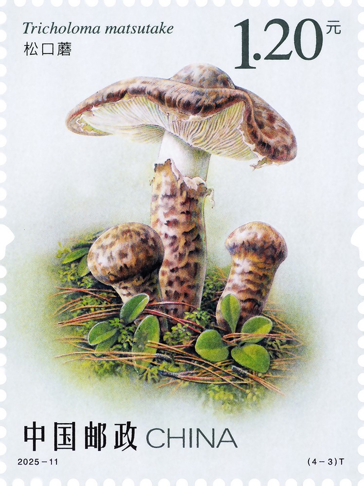 第三枚“松口蘑”,俗稱(chēng)“松茸”,隸屬口蘑科,是世界公認(rèn)的珍稀名貴天然食用菌,同時(shí)也是我國(guó)二級(jí)瀕危保護(hù)物種。松口蘑歷來(lái)被譽(yù)為食用菌中的瑰寶,享有“蘑菇之王”的美譽(yù),珍貴無(wú)比。郵票采用細(xì)致的筆法刻畫(huà)松口蘑菌蓋表面的細(xì)微紋理及菌柄的粗壯形態(tài),同時(shí)背景加入松林元素,以柔和的光影表現(xiàn)其生長(zhǎng)環(huán)境,增強(qiáng)畫(huà)面的自然氛圍。