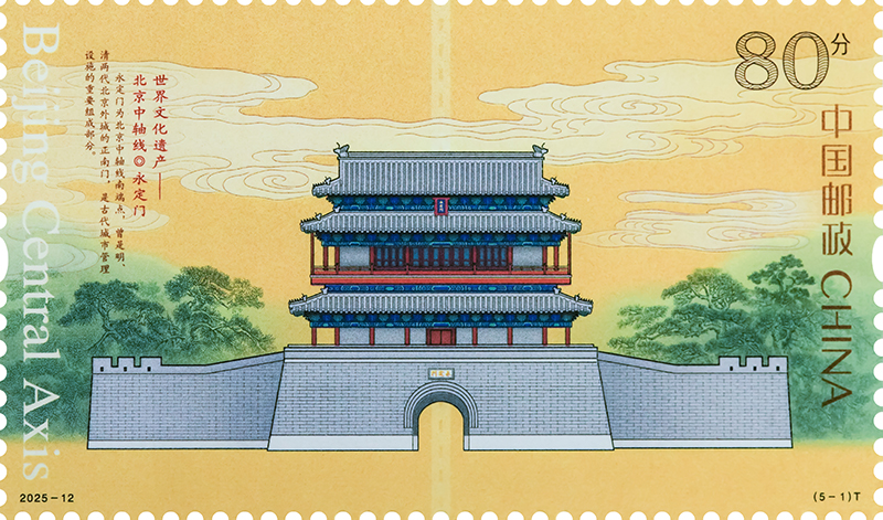 中國郵政定于2025年7月27日發(fā)行《世界文化遺產(chǎn)——北京中軸線》特種郵票1套5枚。郵票圖案名稱為:永定門、正陽門、天安門、故宮·景山、鐘鼓樓。全套郵票面值5.50元。郵票計劃發(fā)行數(shù)量為套票570萬套,版式二69.3萬版。