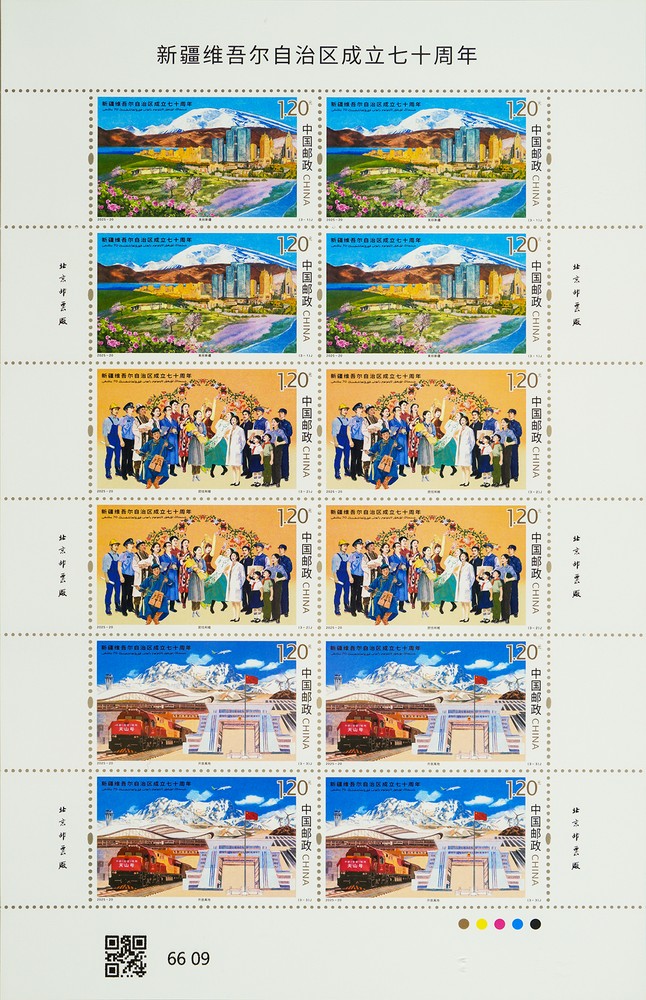 中國郵政定于2025年9月21日發(fā)行《新疆維吾爾自治區(qū)成立七十周年》紀念郵票1套3枚,郵票圖案名稱為:美麗新疆、團結和睦、開放高地。全套郵票面值3.60元,計劃發(fā)行數量為490萬套。
